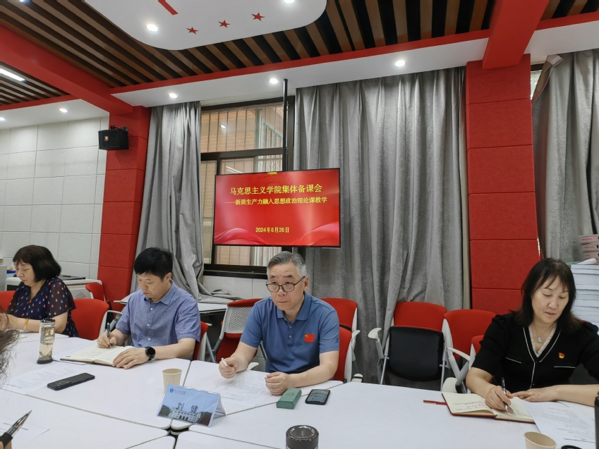 6月26日上午9:30,马克思主义学院在思政课教学实践中心召开集体备课会,研究讨论新质生产力如何融入思想政治理论课教学。备课会由马原教研室主任孙凤兰主持。校党委常委、副校长刘健出席会议并讲话。马克思主义学院直属党支部书记张亚军,院长葛翠柏,副书记石红霞以及全体思政课教师参加了本次备课会。