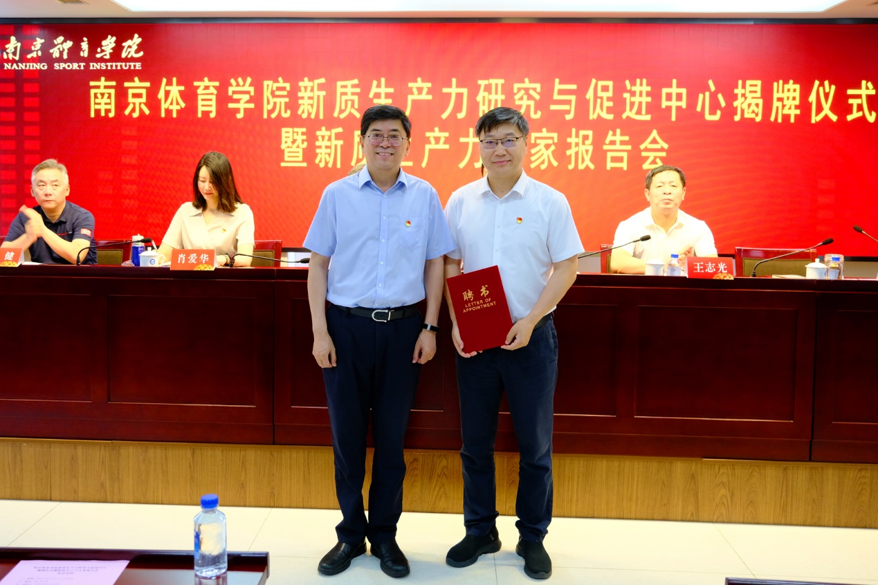 杨国庆宣读了关于成立南京体育学院新质生产力研究与促进中心的通知,并为中心主任陈爱国颁发了聘书。