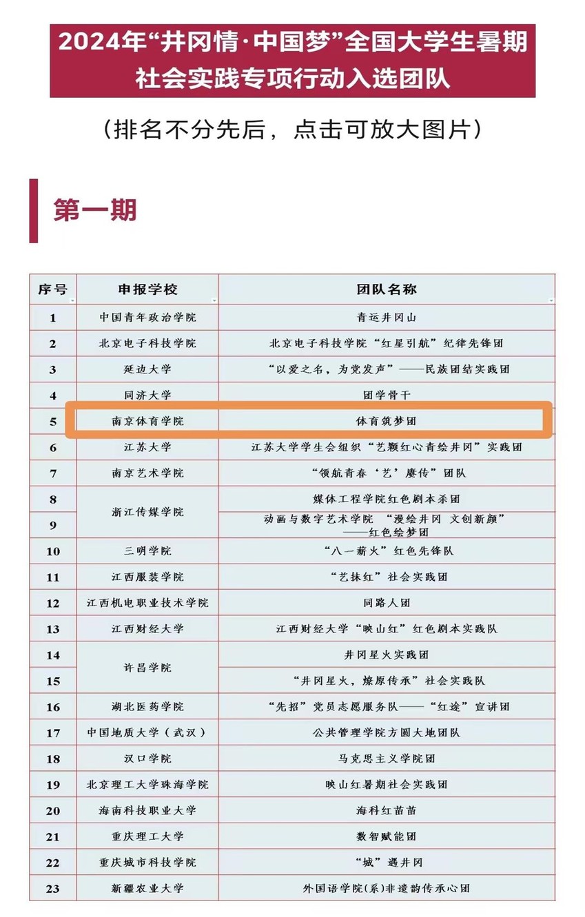 近日,团中央井冈山教育基地发布《2024年“井冈情·中国梦”全国大学生暑期社会实践专项行动入选团队名单公告》。体育教育与人文学院卢奎、乐晓云指导的社会实践团队以江苏省内高校排名第一顺序入选。我校也是全国253所入选高校中唯一的体育类院校。