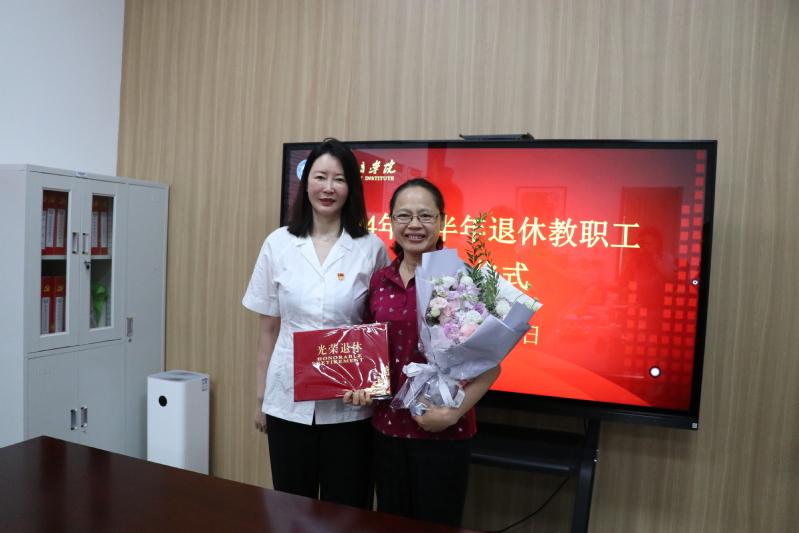 最后,肖爱华和张健为参会的荣休教职工颁发了荣休证书、鲜花及纪念品,送上温馨祝福,并合影留念。