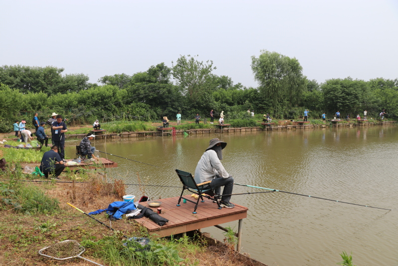 比赛当天,阳光明媚,清风拂面。大家早早来到现场,准备好钓具,选择钓位有序坐好。上午八点半,随着张健一声令下,钓鱼比赛正式拉开帷幕。钩、漂、鱼护下水,选手们纷纷展示出自己的高超技巧。大家全神贯注,或站或坐,挥杆拉鱼,欢声笑语,相互交流垂钓经验,享受钓鱼乐趣。安宁秀丽的田园风光和紧张的比赛相映成趣,形成了一道和谐美丽的风景。大家在清新的大自然中愉悦了心情,也在有趣的比赛中锻炼了身体。
