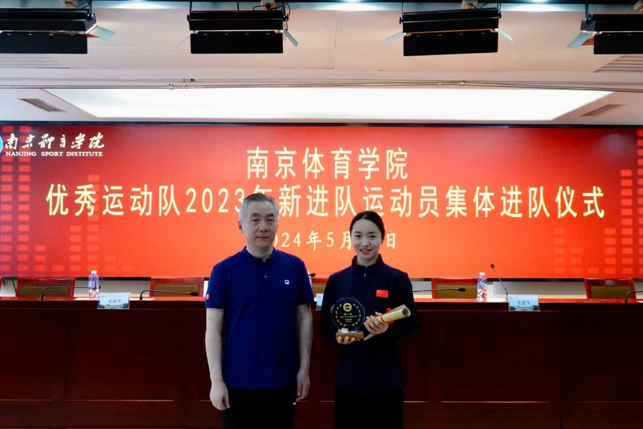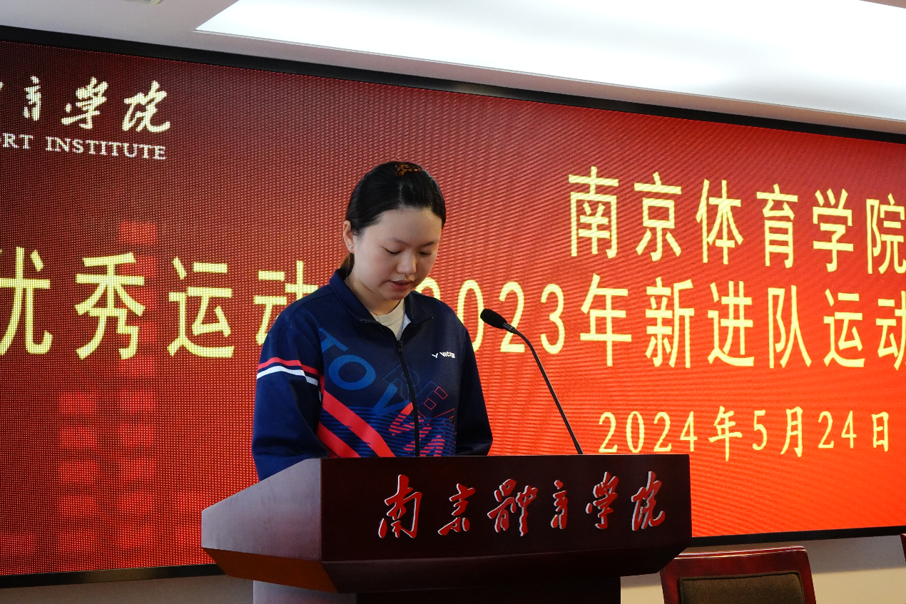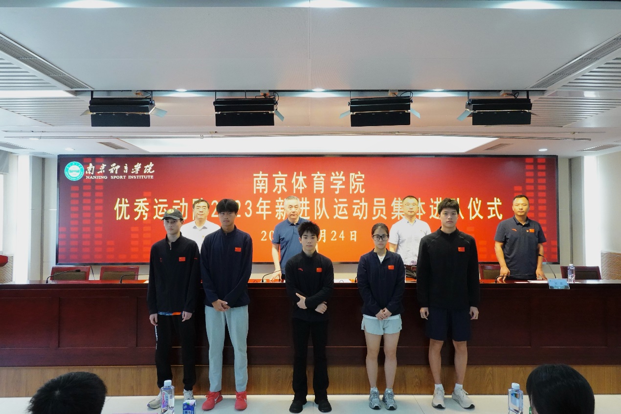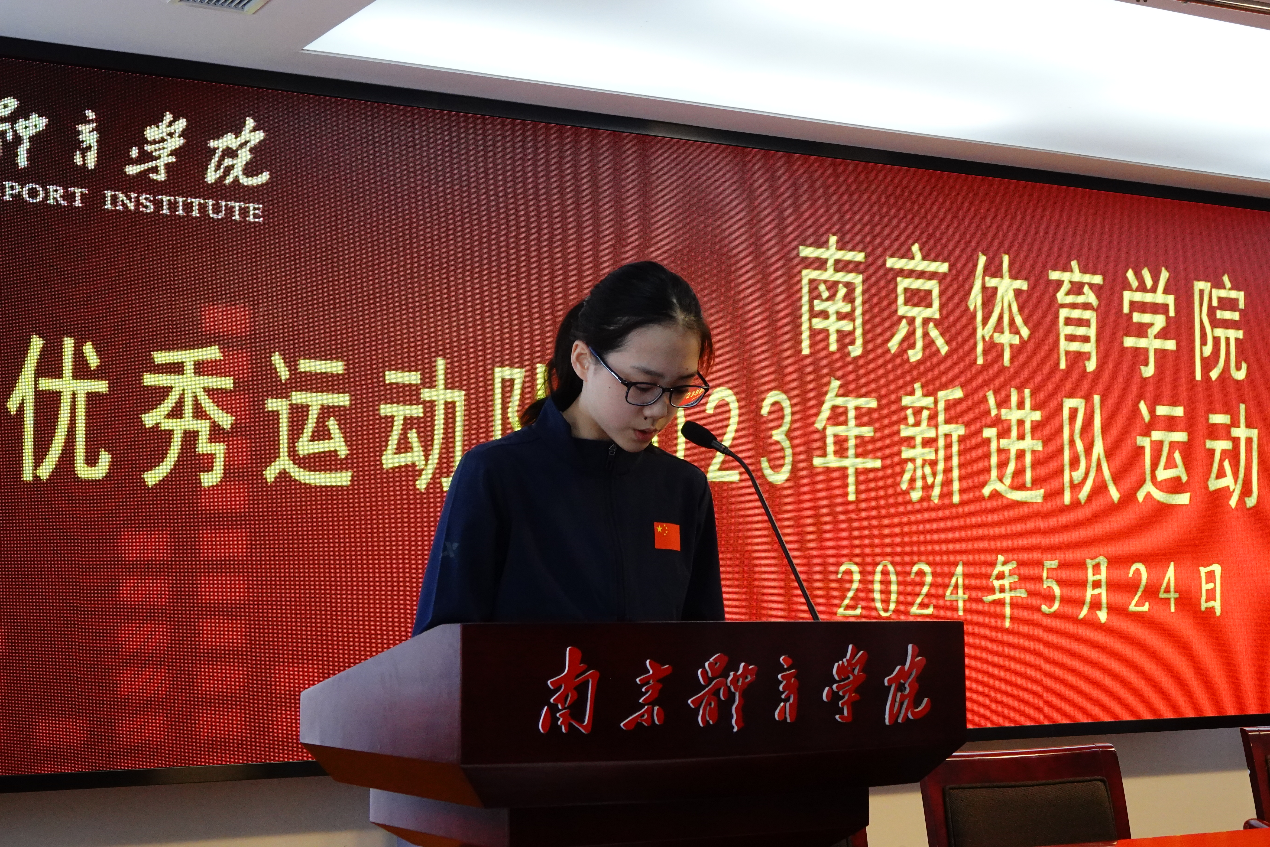 集体观看南京体育学院2023年训练备战工作及“最美巾帼奋斗者”张雨霏介绍片后,仪式在雄壮的国歌声中正式开始。人事处处长王龙飞宣读了《省人力资源社会保障厅关于同意招聘胡畅等159名同志为省优秀运动队运动员的复函》;副校长刘健为新进队运动员颁发了进队证书和纪念牌并合影;羽毛球世界冠军夏玉婷代表南京体育学院优秀运动队老队员发言,并带领新队员庄严宣誓;花样游泳队运动员魏落回代表新队员发言;5名新队员代表上台向学校递交了反兴奋剂承诺书。