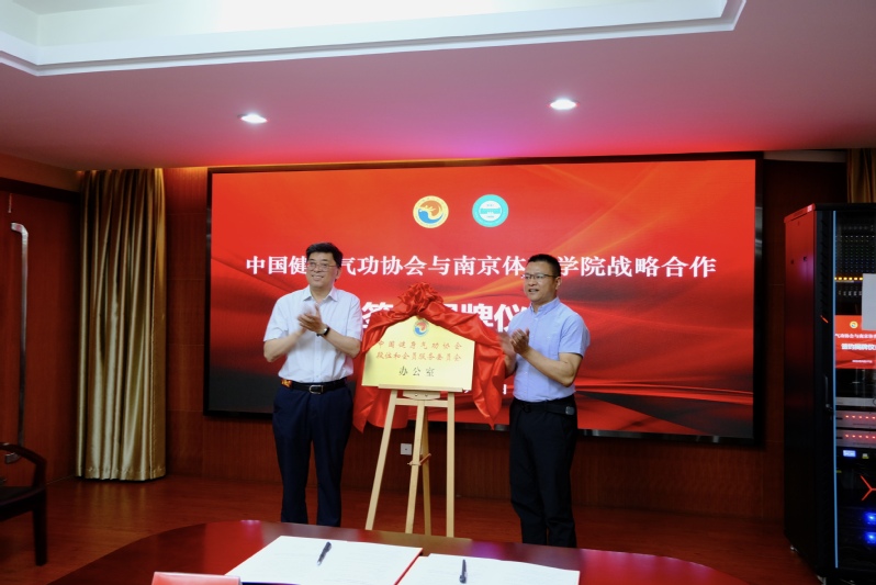 仪式上,杨国庆和王涛共同为中国健身气功协会段位和会员服务委员会办公室揭牌。肖爱华和王涛分别代表南京体育学院和中国健身气功协会签署了《国家体育总局健身气功管理中心、中国健身气功协会与南京体育学院战略合作协议》。