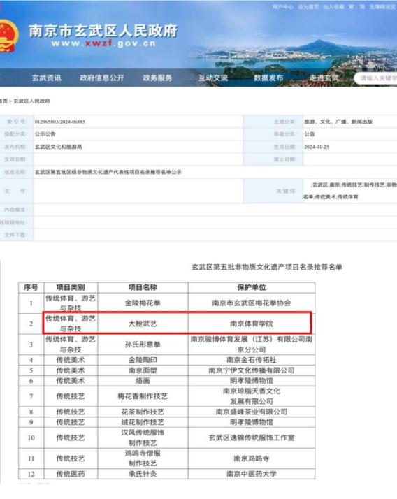 近日,由武术与艺术学院武术系申报的“大枪武艺”,经过初选、专家评审等环节,成功入选南京市玄武区非物质文化遗产项目名录,这是我校作为保护主体单位入选的第一个非遗项目。