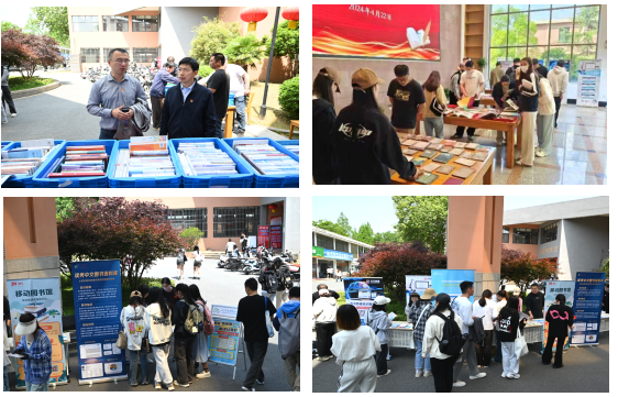 图书馆还在门厅外侧举办了电子文献数据库资源现场展览、灵谷·百草园读书会会员现场招募、江苏省高校精品教材巡展等活动。