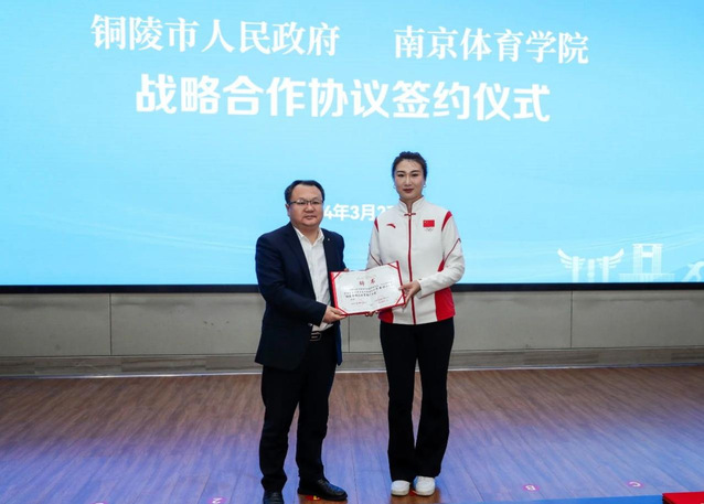 铜陵市教体局向许安琪颁发铜陵市群众体育推广大使聘书