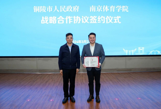 3月27日上午,南京体育学院与铜陵市政府战略合作协议签约仪式在铜陵市行政中心举行。南京体育学院党委书记刘红明、铜陵市委书记丁纯出席签约仪式并讲话。签约仪式由铜陵市委常委、秘书长马军主持。南京体育学院党委副书记兰亚明,铜陵市政府副市长杨文萍、市政府二级巡视员牛爱平等出席签约仪式。南京体育学院党政办、团委等部门负责人,共青团铜陵市委、市教体局等相关单位负责人参加仪式。