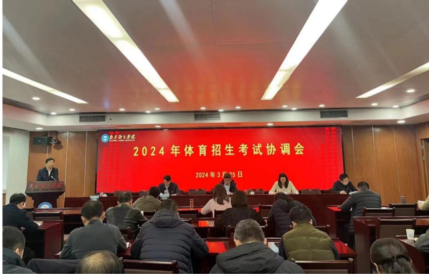 为进一步做好2024年体育类招生考试工作,确保考试各项环节平稳有序进行,3月25日下午,我校在行政楼201会议室召开2024年体育类招生考试协调会,校党委副书记、校长、考务领导小组总主考杨国庆出席会议并讲话,校党委常委、副校长、考务领导小组执行总主考肖爱华主持会议,党委常委、党委宣传部部长、党委统战部部长许立俊,党委常委、党政办主任王猛,党委常委、组织部部长、学工处处长殷怀刚,以及机关、后勤、教学、训练各相关部门单位负责人参加了会议。
