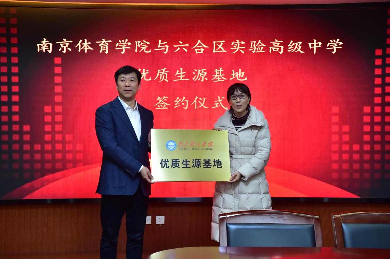 会上,郁东与杨莉莉共同签署了生源基地建设合作协议,殷怀刚为陆敏授予“南京体育学院优质生源基地”牌匾。