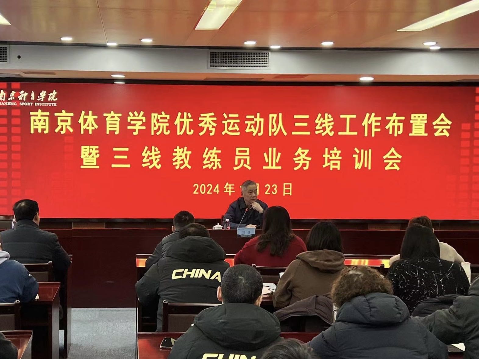 1月23日,我校训练部门在行政办公楼201会议室召开优秀运动队三线工作布置会暨三线教练员业务培训会。校党委常委、副校长刘健出席并主持会议,各竞技体育二级学院书记、办公室主任,各优秀运动队领队、副领队,附属学校校长、副校长,全体三线教练员及训练处相关人员参加会议。