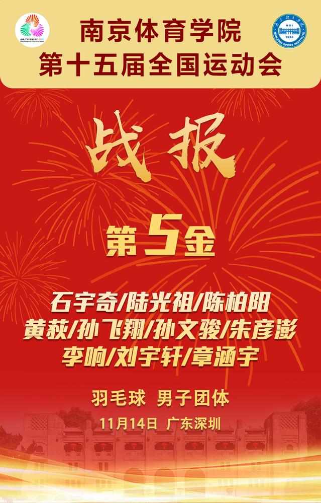 11月15日凌晨,第十五届全国运动会羽毛球成年组男子团体决赛在广东深圳落下帷幕,由南体健儿石宇奇、陆光祖、孙飞翔、黄荻、陈柏阳、孙文骏、朱彦澎、李响、刘宇轩、章涵宇组成的江苏队以3:2战胜浙江队,时隔16年再夺成年组男子团体冠军!这是南京体育学院在本届全运会上夺得的第5枚金牌。